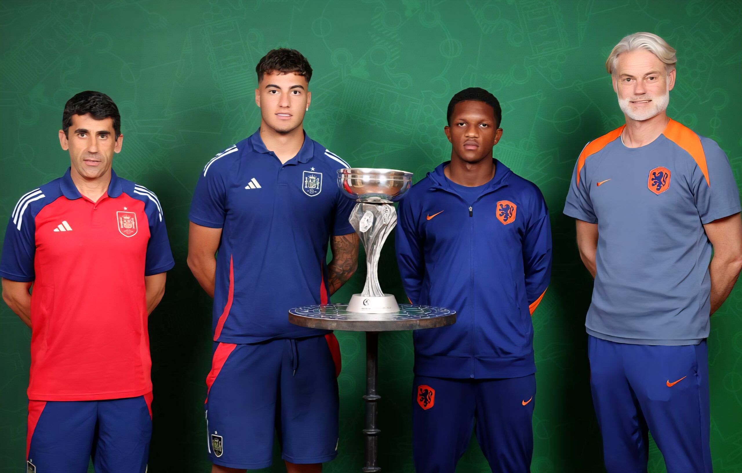 Spain head coach Francisco “Paco” Gallardo Leon, captain Raul Jimenez, Netherlands captain Givairo Read and head coach Peter van der Veen with the trophy before